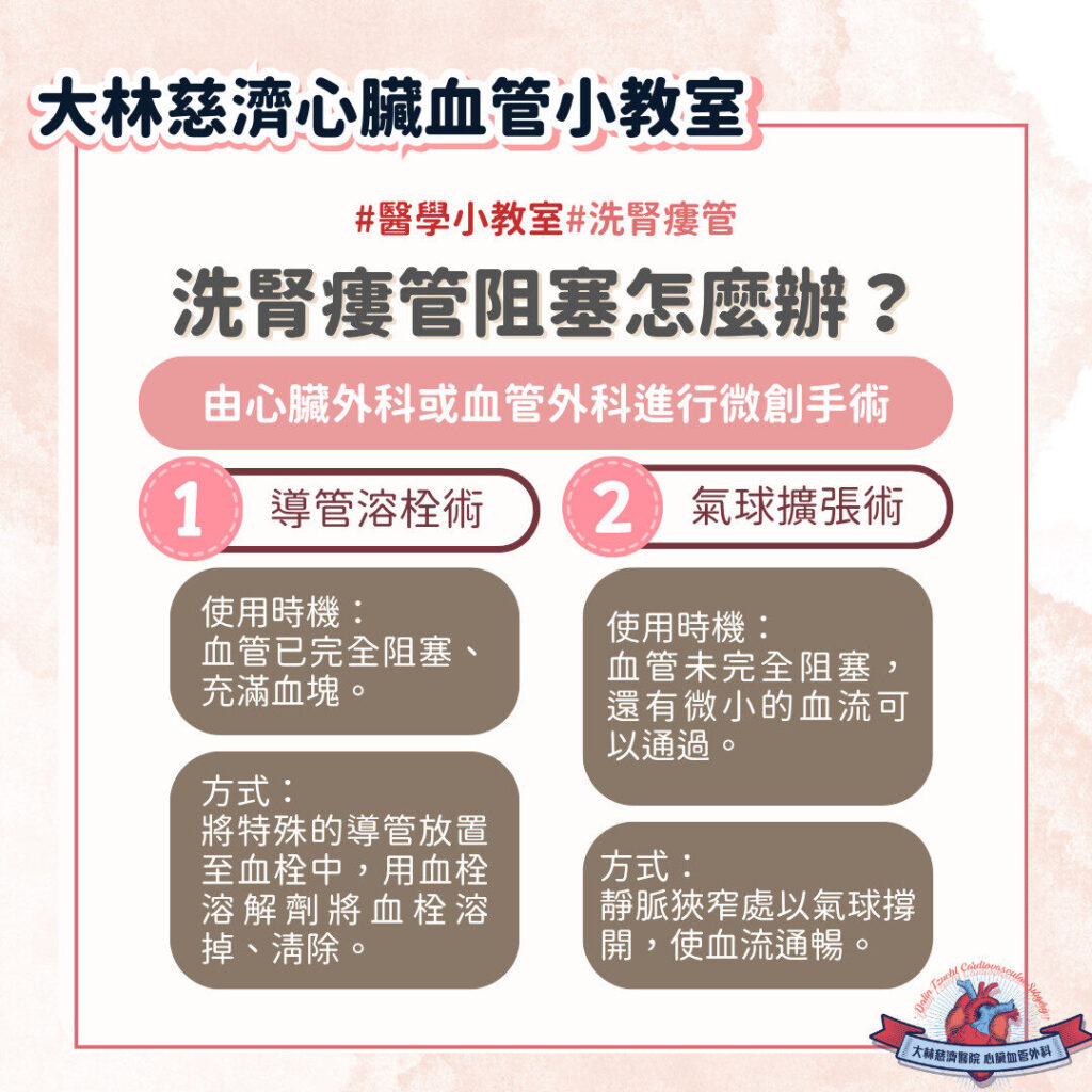 溶栓手術:阻塞的廔管醫師會用導管抽吸血栓合併氣球擴張術,或是打入血栓溶解藥劑進行溶栓後,再行氣球擴張術。