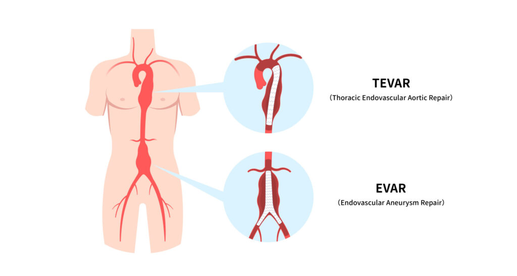 • TEVAR(Thoracic Endovascular Aortic Repair):適用於胸主動脈瘤(TAA)或降主動脈剝離,同樣透過導管方式,在胸段主動脈置放支架修補瘤或剝離部位 。