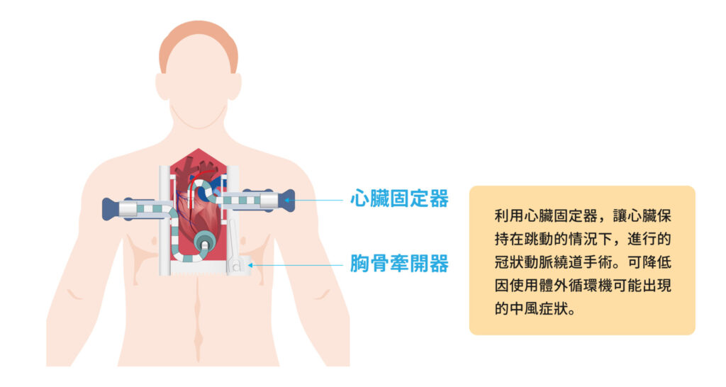 - 心臟不停跳:術中不停止心跳,使用穩定器固定局部血管進行搭橋