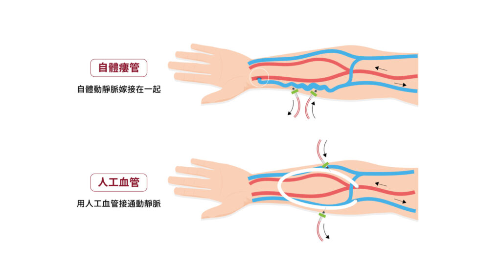 - 自體瘻管建立:將動脈與靜脈直接相接(如前臂橈動脈+頭靜脈)