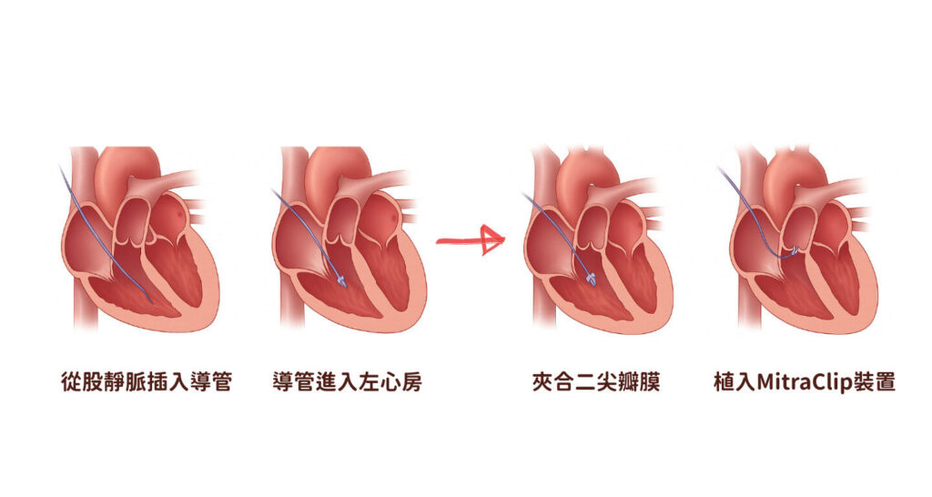 MitraClip 是一種經導管方式進行的二尖瓣修補術,屬於微創心臟介入技術。手術過程中,醫師會透過股靜脈插入導管,經心房中隔穿刺進入左心房,將 MitraClip 裝置夾住二尖瓣的前後瓣葉,減少血液逆流。